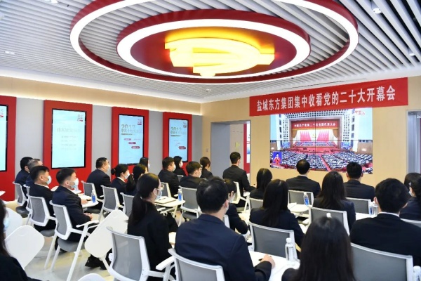 10月16日上午10點(diǎn),中國共產(chǎn)黨第二十次全國代表大會在北京人民大會堂開幕。鹽城東方集團(tuán)組織全體黨員、中層及以上人員等集中收看黨的二十大電視直播盛況,認(rèn)真聆聽習(xí)近平總書記所作的《高舉中國特色社會主義偉大旗幟,為全面建設(shè)社會主義現(xiàn)代化國家而團(tuán)結(jié)奮斗》的工作報告。