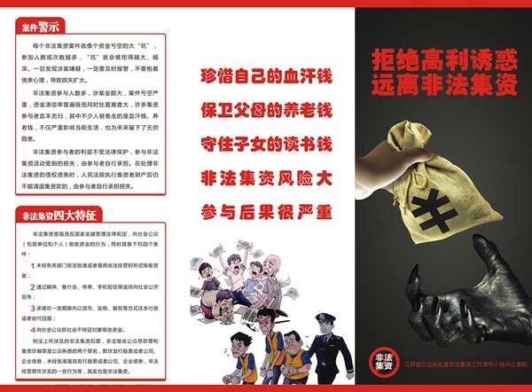 希望廣大人民群眾都能積極投身到防范和打擊非法集資的行為中來(lái),認(rèn)真學(xué)習(xí)和掌握非法集資的特征,做到“三看三思三不要”。切實(shí)認(rèn)清非法集資的本質(zhì)和危害,自覺(jué)增強(qiáng)防范意識(shí)、理性投資意識(shí),堅(jiān)信“天下沒(méi)有免費(fèi)的午餐”,切記“你惦記他的高額回報(bào),他惦記你投入的本金”,高收益往往伴隨著高風(fēng)險(xiǎn),自覺(jué)抵制各種誘惑,依法保護(hù)自身權(quán)益。對(duì)高額回報(bào)、快速致富的投資項(xiàng)目要冷靜分析、三思而后行,多向?qū)I(yè)機(jī)構(gòu)、專業(yè)人士咨詢;對(duì)不熟悉的理財(cái)項(xiàng)目或公司要多問(wèn)幾個(gè)“為什么”,究竟有沒(méi)有權(quán)威部門(mén)的批準(zhǔn),經(jīng)營(yíng)范圍有哪些,到底違不違反國(guó)家法律,決不輕信高額利息的許諾,真正做到珍惜辛苦錢(qián)、守好血汗錢(qián),遠(yuǎn)離非法集資活動(dòng)。同時(shí),要增強(qiáng)風(fēng)險(xiǎn)自擔(dān)意識(shí),謹(jǐn)記參與非法集資造成的損失要自行承擔(dān)。