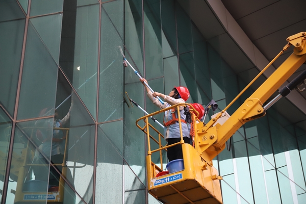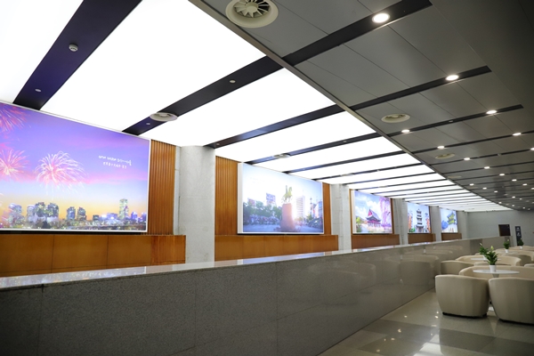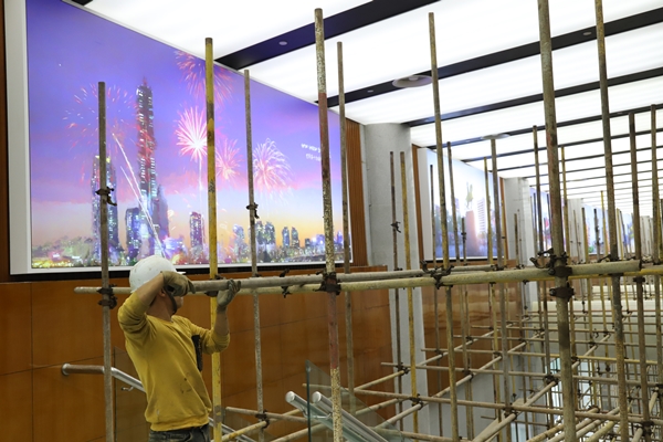 場館提升改造過程中,項目管理人員與現(xiàn)場50多名工人日夜忙碌、并肩作戰(zhàn),開足馬力推進會議中心燈光亮化和LED顯示屏安裝工程。一手搶抓工期,科學(xué)制定施工方案,對施工單位明確獎懲條款,在充分利用時間的同時合理套搭施工,提高施工效率;一手與施工單位簽訂安全生產(chǎn)責(zé)任狀,定時定點巡查安全質(zhì)量隱患,確保安全“零事故”和質(zhì)量“高品質(zhì)”。截止目前,項目現(xiàn)場安裝完成3LED顯示屏,二樓會議大廳頂部噴淋改造,舞臺燈具槽、吊頂及會場燈具安裝均已完成,中心休息區(qū)及貴賓室升級等工程已順利完工。為做好全館保潔、室外的環(huán)境衛(wèi)生等工作,東方物業(yè)自430日接到通知后,即刻行動,清洗噴泉池及室外廣場,修理噴水泵及廣場石材等,并配合做好改造后的全館保潔、零星維修、現(xiàn)場安保、音響及大屏調(diào)試等工作。