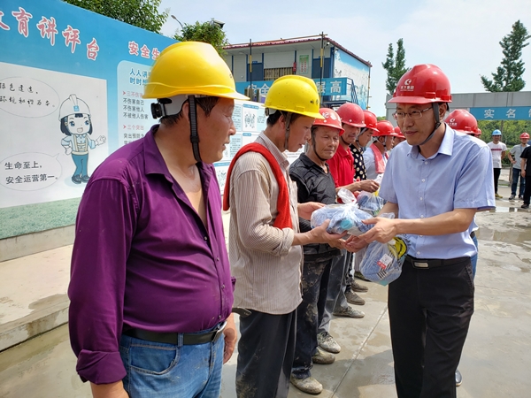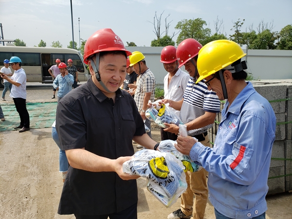 在施工現場,集團領導與建設人員一一握手,送上毛巾、花露水、清涼油、人丹、礦泉水等防暑用品,并詳細詢問了在現場施工工人的作息時間、防暑用品飲品使用、安全施工操作等情況。張振國強調,要高度重視建設人員勞動保護措施和施工生產安全工作,扎實推進防暑降溫各項工作的開展,督促做好后勤保障服務,改善一線施工人員生產、生活條件、廣泛宣傳防暑降溫知識、為奮戰(zhàn)在一線的建設者全面做好防暑降溫保障工作,并叮囑大家高溫季節(jié)注意調整作息時間,合理安排工作時間,要注意防暑降溫,注意高溫施工安全,在保障安全的前提下,利用早晚涼爽的時間段,保質保量完成工程建設任務。