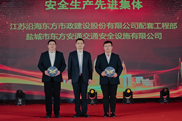 鹽城東方集團黨委委員、副總經(jīng)理王建旭為“安全生產(chǎn)先進集體”代表頒獎。