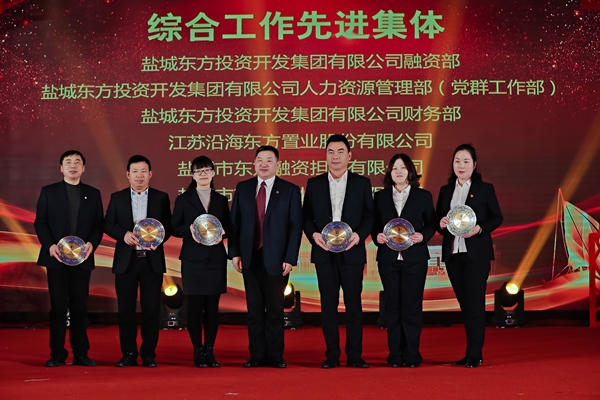 鹽城東方集團黨委書記、董事長張振國為“綜合工作先進集體代表頒獎。