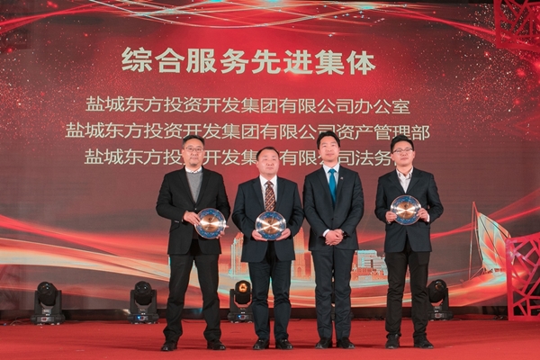 鹽城東方集團黨委委員、副總經(jīng)理許榮偉為“綜合服務(wù)先進集體”頒獎。
