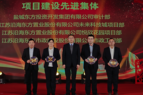 鹽城東方集團黨委副書記、副董事長、總經(jīng)理王旭東為“項目建設(shè)先進集體”代表頒獎。