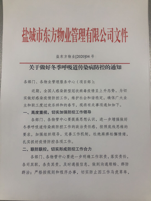 春節(jié)臨近,新型冠狀病毒卻來勢洶洶,各區(qū)域的疫情牽動著東方物業(yè)全體員工和廣大業(yè)戶的心。作為防控第一線,東方物業(yè)快速反應(yīng),科學(xué)應(yīng)對,全力以赴開展疫情防控行動,確保全體員工和廣大業(yè)戶度過一個安定、祥和的春節(jié)。