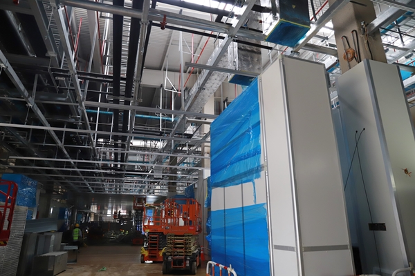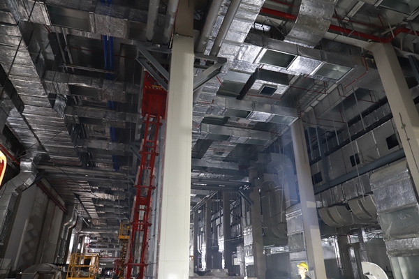在總承包中鐵建工集團建筑安裝有限公司的現(xiàn)場負責人的引導下,東方集團一行人參觀學習了該項目的電極棟、組裝棟、活性棟等主生產(chǎn)廠房以及其他輔助用房。項目負責人就各觀摩區(qū)域的亮點向觀摩人員作一一介紹,該工程的建筑形式為鋼結構建筑,以電極棟一層為例,天花板上部共有21個系統(tǒng)機電管線,管線布置及其復雜,為了解決管線碰撞問題,項目指揮部開展BIM管線綜合深化設計。項目部合理整潔衛(wèi)生的施工場地、醒目的標語標識牌、規(guī)范的施工工藝、文明安全的施工氛圍,給前來觀摩的人員留下深刻的印象。