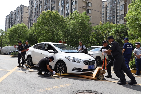 為了在緊急時(shí)刻快速疏通消防車(chē)通道,打通消防救援的“最后一公里”。 康欣花園項(xiàng)目部配置了2臺(tái)輕便實(shí)用的挪車(chē)器。該挪車(chē)器由四個(gè)相同的部件組成,底部采用萬(wàn)向輪。只見(jiàn)4名保安人員利用液壓設(shè)備抬升汽車(chē)的四個(gè)輪胎,合力推動(dòng)挪車(chē)器,便可快速移走占道車(chē)輛,為消防車(chē)清除障礙。