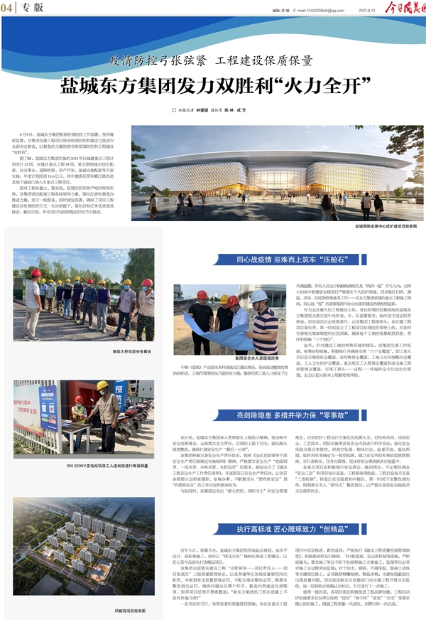 8月13日,今日開(kāi)發(fā)區(qū)報(bào)以《疫情防控弓張弦緊 工程建設(shè)保質(zhì)保量——鹽城東方集團(tuán)發(fā)力雙勝利“火力全開(kāi)”》為題,整版報(bào)道鹽城東方集團(tuán)疫情防控和工程建設(shè)“兩手抓、兩不誤”,奮力奪取“雙勝利”的主要舉措。