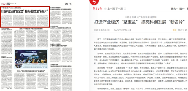 10月11日,《新華日?qǐng)?bào)》15版頭條聚焦中韓(鹽城)產(chǎn)業(yè)園未來(lái)科技城,以鹽城經(jīng)開(kāi)區(qū)聚力打造提升產(chǎn)業(yè)能級(jí)、集聚科創(chuàng)財(cái)富的重要載體為重點(diǎn),深入報(bào)道鹽城東方集團(tuán)將未來(lái)科技城項(xiàng)目工程建設(shè)和招商牽頭單位兩項(xiàng)重責(zé)“一肩挑”,創(chuàng)新招商方式,賦能營(yíng)商環(huán)境,吸引一系列優(yōu)質(zhì)項(xiàng)目紛至沓來(lái)的舉措和成果。