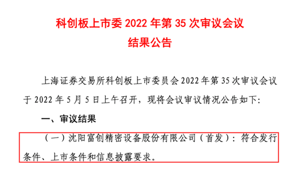 5月5日,上海證券交易所科創(chuàng)板上市委員會(huì)2022年第35次審議會(huì)議結(jié)果公告顯示,鹽城東方集團(tuán)參投的沈陽富創(chuàng)精密設(shè)備股份有限公司(以下簡稱“富創(chuàng)精密”)的科創(chuàng)板首發(fā)申請獲通過。