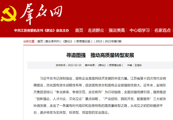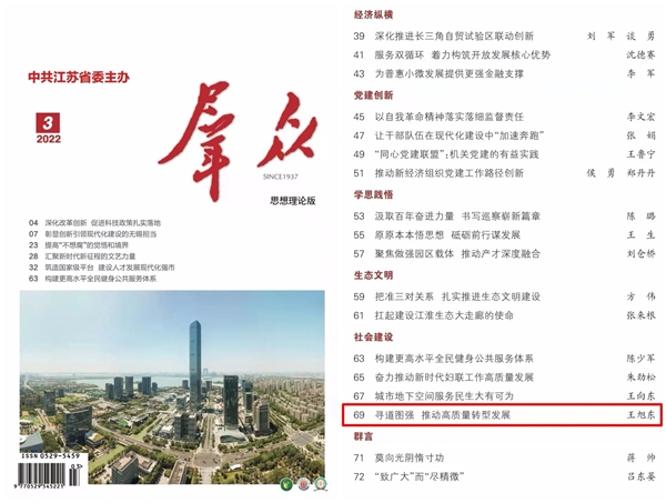 近日,由中共江蘇省委主辦的《群眾》雜志(思想理論版)2022年3月刊“社會(huì)建設(shè)”欄目刊登王旭東董事長(zhǎng)署名文章——《尋道圖強(qiáng) 推動(dòng)高質(zhì)量轉(zhuǎn)型發(fā)展》。