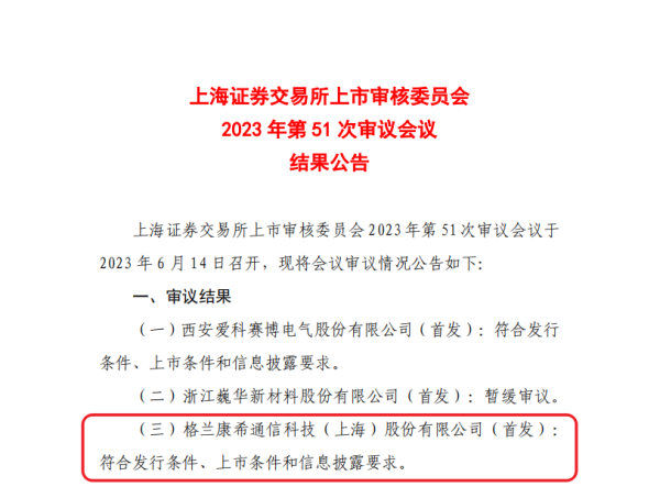 2023年6月14日,經(jīng)上海證券交易所上市審核委員會(huì)2023年第51次審議會(huì)議,鹽城東方集團(tuán)投資的格蘭康希通信科技(上海)股份有限公司首發(fā)順利過(guò)會(huì)!