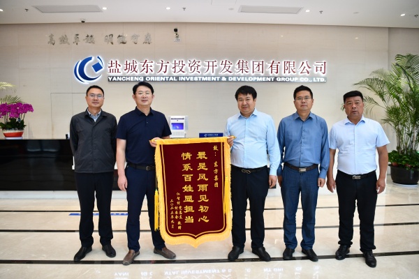 10月7日,鹽城經(jīng)開區(qū)步鳳鎮(zhèn)副鎮(zhèn)長(zhǎng)李軍一行來到鹽城東方集團(tuán),將一面寫著“最是風(fēng)雨見初心,情系百姓顯擔(dān)當(dāng)”的錦旗送到集團(tuán)黨委委員、副總經(jīng)理王成林手上,對(duì)集團(tuán)爭(zhēng)分奪秒為仁智村復(fù)建家園表示衷心的感謝。