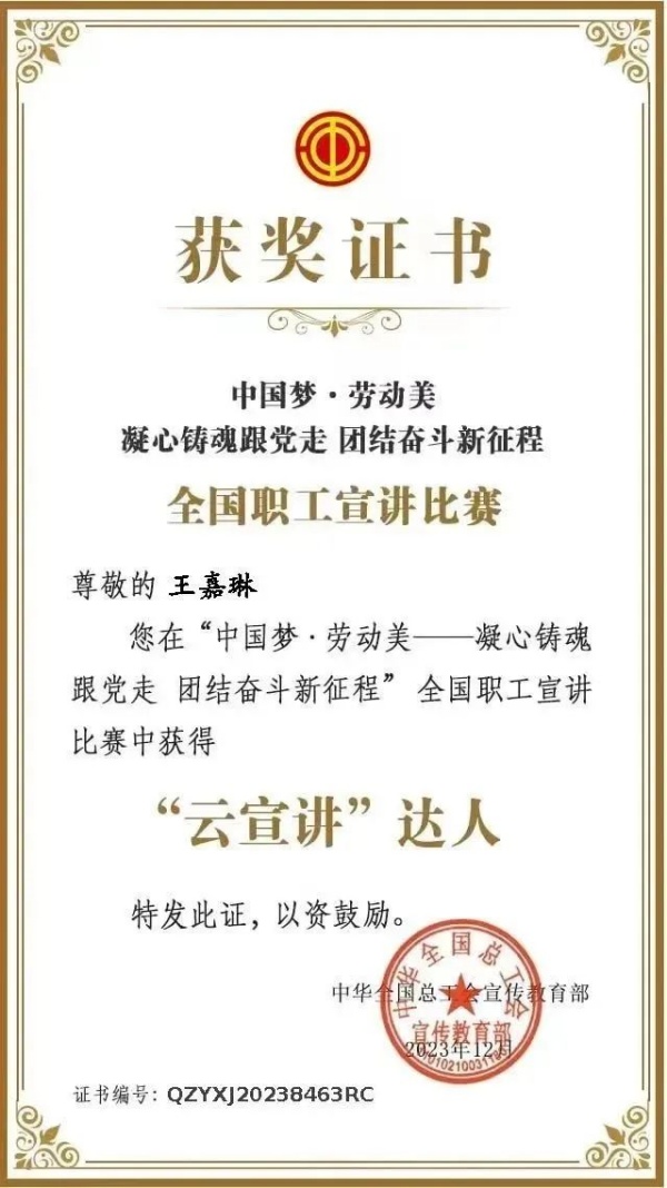 近日,中華全國總工會主辦,全國總工會宣傳教育部、安徽省總工會、中國工人出版社承辦的“中國夢·勞動美——凝心鑄魂跟黨走 團(tuán)結(jié)奮斗新征程”全國職工宣講比賽獲獎名單揭曉,鹽城東方集團(tuán)旗下江蘇東投房地產(chǎn)開發(fā)有限公司辦公室王嘉琳榮獲“云宣講”達(dá)人稱號。