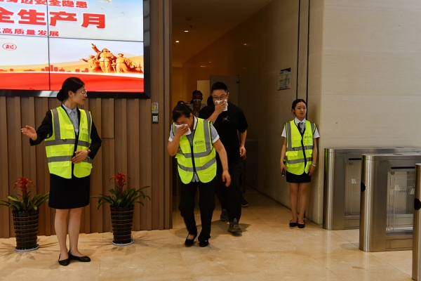 上午十點(diǎn)整,演練正式開(kāi)始,集團(tuán)大樓六樓發(fā)現(xiàn)火情,消防廣播,聲光警報(bào)等響起,安保巡邏人員、微型消防站救火隊(duì)員、電梯維保單位以及傷員救援組按照既定演練流程,迅速分時(shí)點(diǎn)到達(dá)任務(wù)點(diǎn)位,分別完成初期火災(zāi)救援、停用電梯、傷員救助以及大樓內(nèi)人員應(yīng)急疏散撤離任務(wù)。