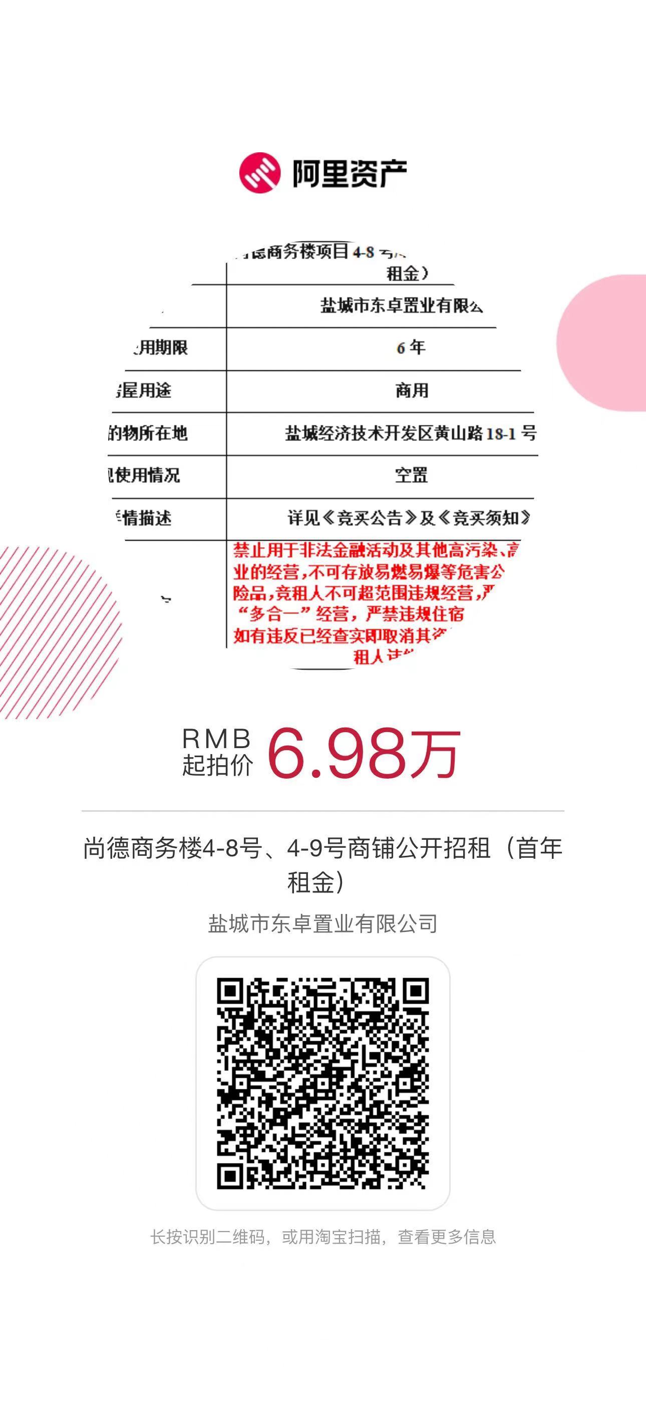 鹽城市東卓置業(yè)有限公司將于2023年6月16日10時起至2023年6月17日10時止(延時除外),在阿里拍賣平臺對鹽城經濟技術開發(fā)區(qū)黃山路18-1號尚德商務樓項目部分商鋪進行公開招租,價高者得,具體為: