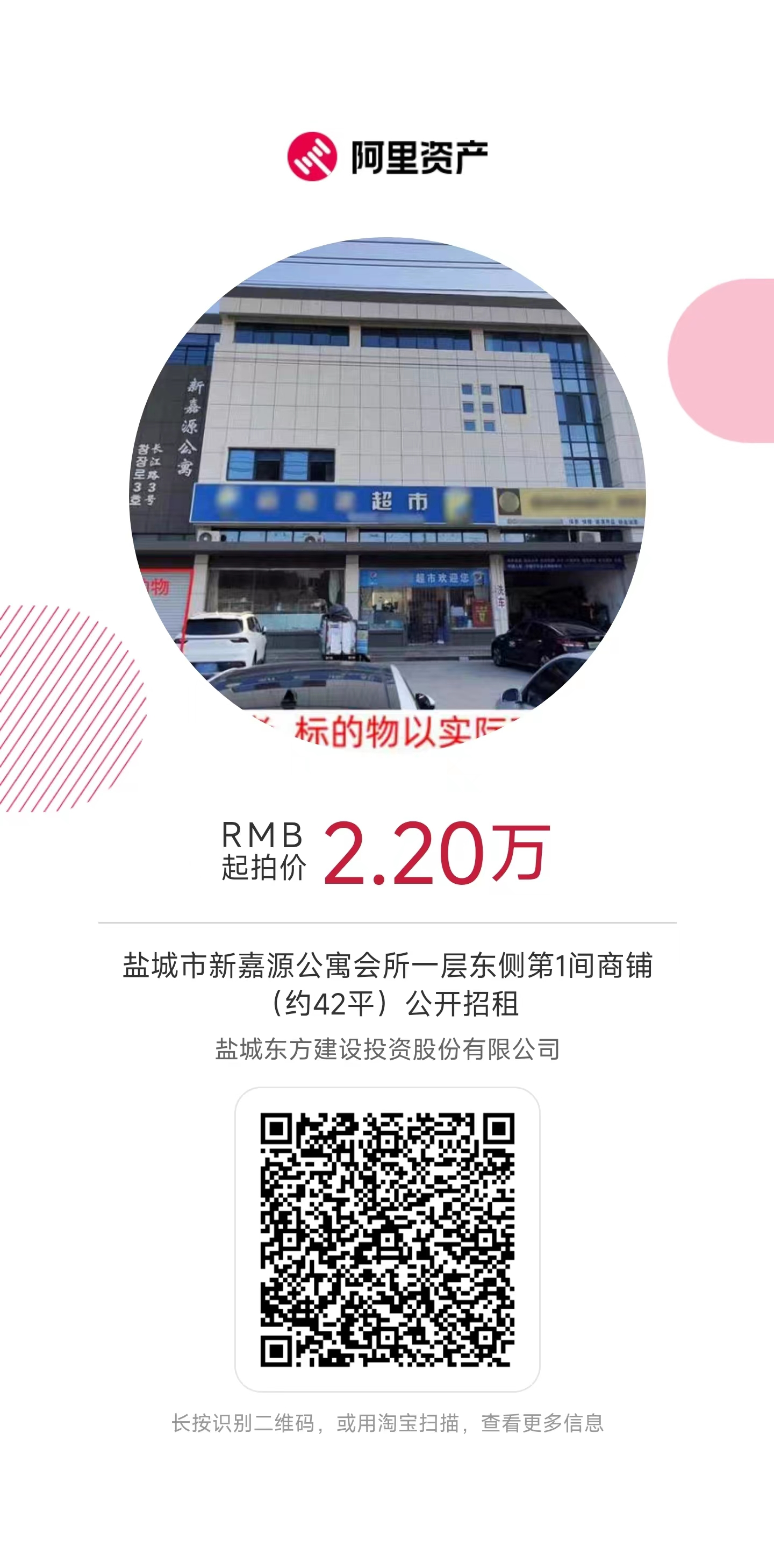 鹽城東方新天地置業(yè)有限公司將于2024年1月12日10時(shí)起至2024年1月13日10時(shí)止(延時(shí)除外),在阿里拍賣平臺(tái)對鹽城經(jīng)濟(jì)技術(shù)開發(fā)區(qū)長江路3號新嘉源公寓會(huì)所一層?xùn)|側(cè)第1間商鋪(約42平)公開招租,免租期2個(gè)月,租賃起拍價(jià):22000元/年。上述房產(chǎn)加價(jià)幅度:500元整或整倍數(shù),租賃期限3年。